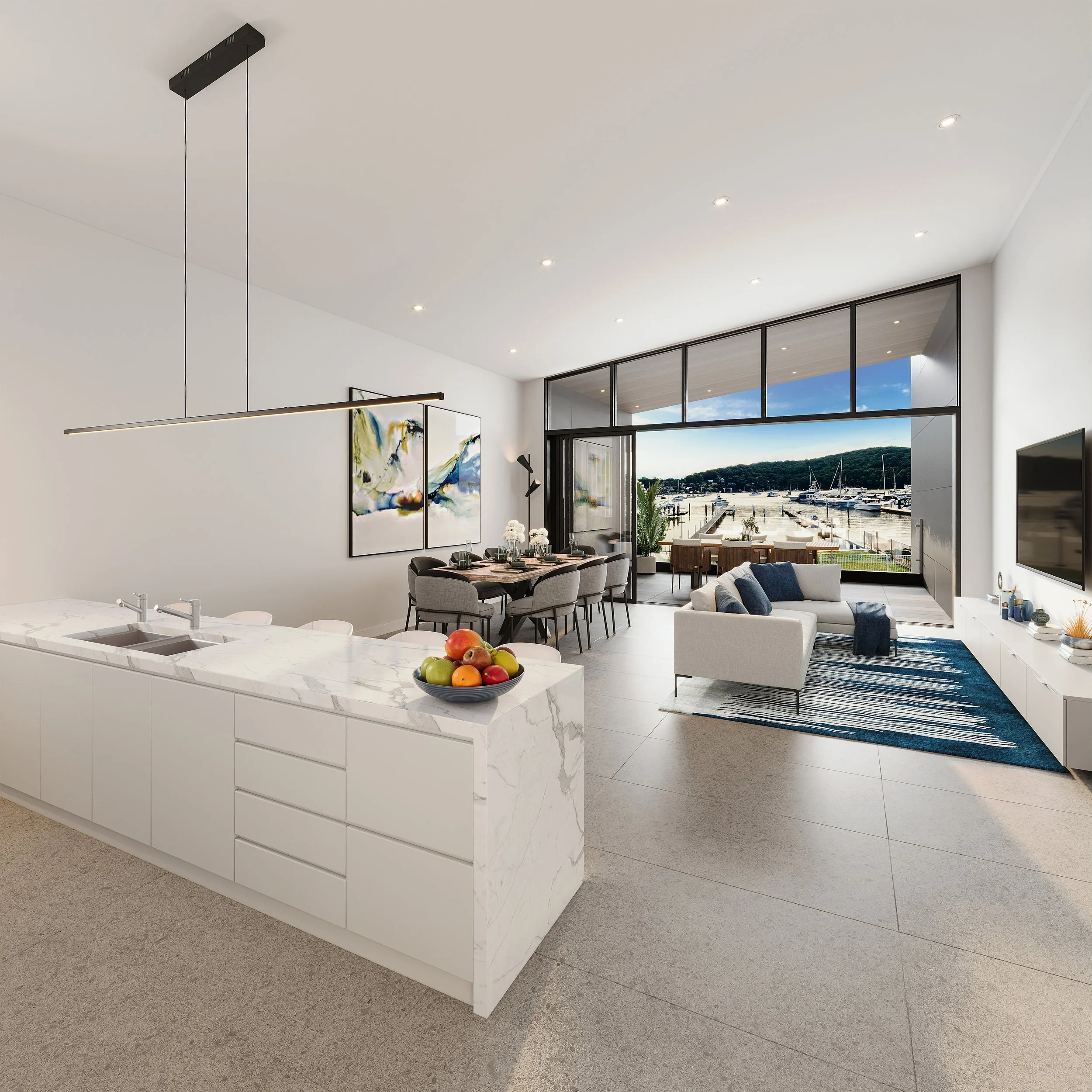Designer kitchen with stone benchtops, quality appliances, ample storage, and a clean, modern aesthetic